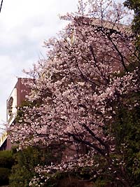 桜並木の後ろに背の高いマンションがあって桜が陰になってたり